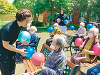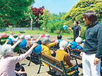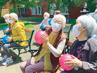先月も大変好評で多くの入居者様が参加されており、今回はお天気がいいので、裏庭に出て青空の下、柔らかいボールやチューブを使い、指先や太もも、胸、背中など、全身の筋肉のトレーニングを行いました。