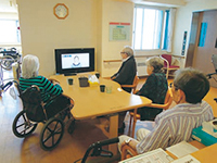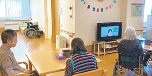 介護棟では、毎週火曜日の午前十時四十分から約十五分間、リハビリスタッフ指導の下、六階でテレビを見ながら入居者皆様と嚥下体操を行っております。